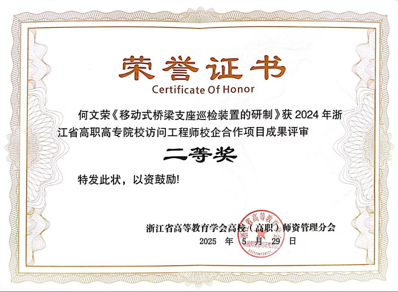 本次成果评审中,全省高职院校从350多项结题项目中,共推荐96个优秀访问工程师校企合作项目参与交流评审。经首轮网上评审,20个优秀项目脱颖而出,成功入围现场交流汇报与答辩环节。其中,何文荣老师主持的“移动式桥梁支座巡检装置的研制”项目,是与访工企业宁波阿贝尼红外技术有限公司开展的校企合作项目。该项目设计了一种基于轨道的自动巡检装置,可对高架桥梁支座进行快速、高效、安全的远程巡检,大幅提升巡检效率,节省巡检成本,降低工作风险,得到了用户高度认可。