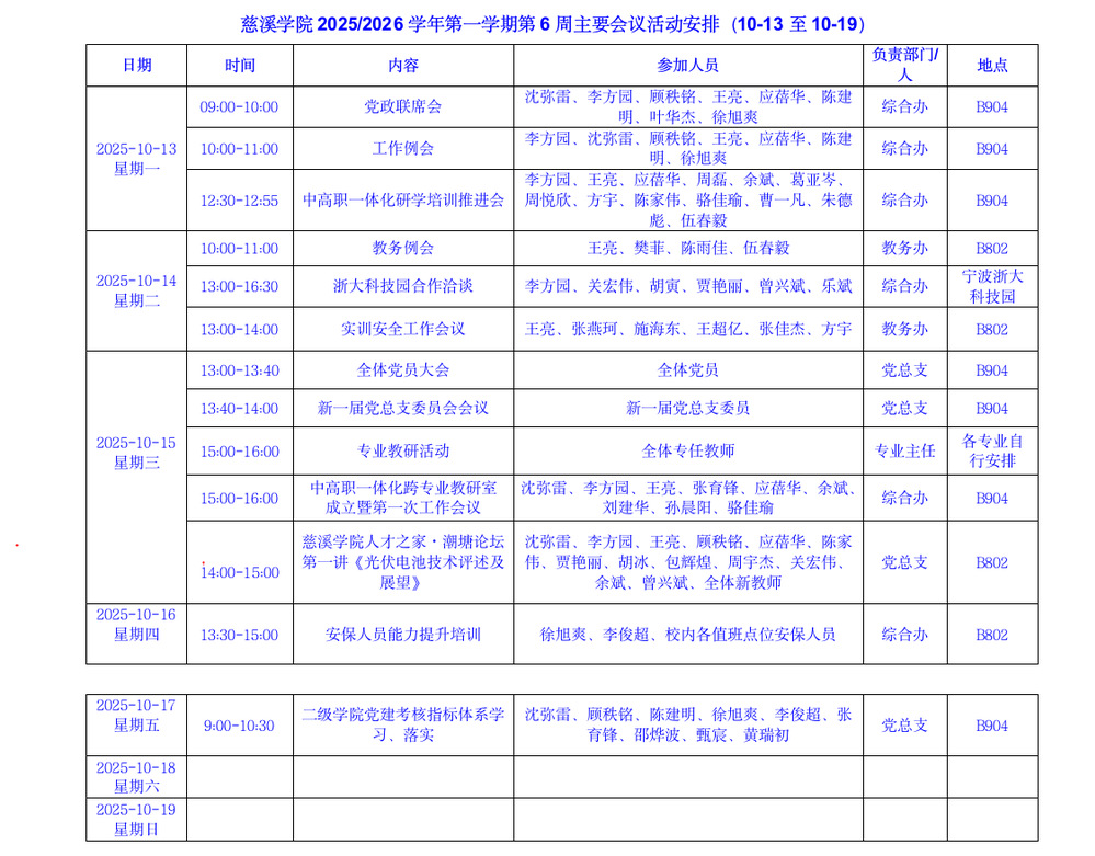 慈溪学院2025/2026学年第一学期第6周主要活动安排