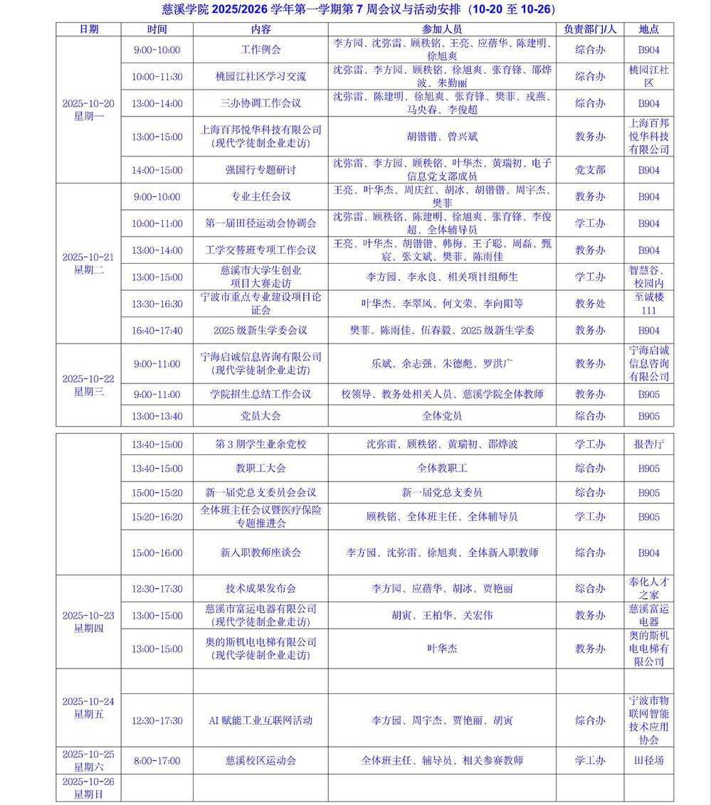 慈溪学院2025/2026学年第一学期第7周主要活动安排