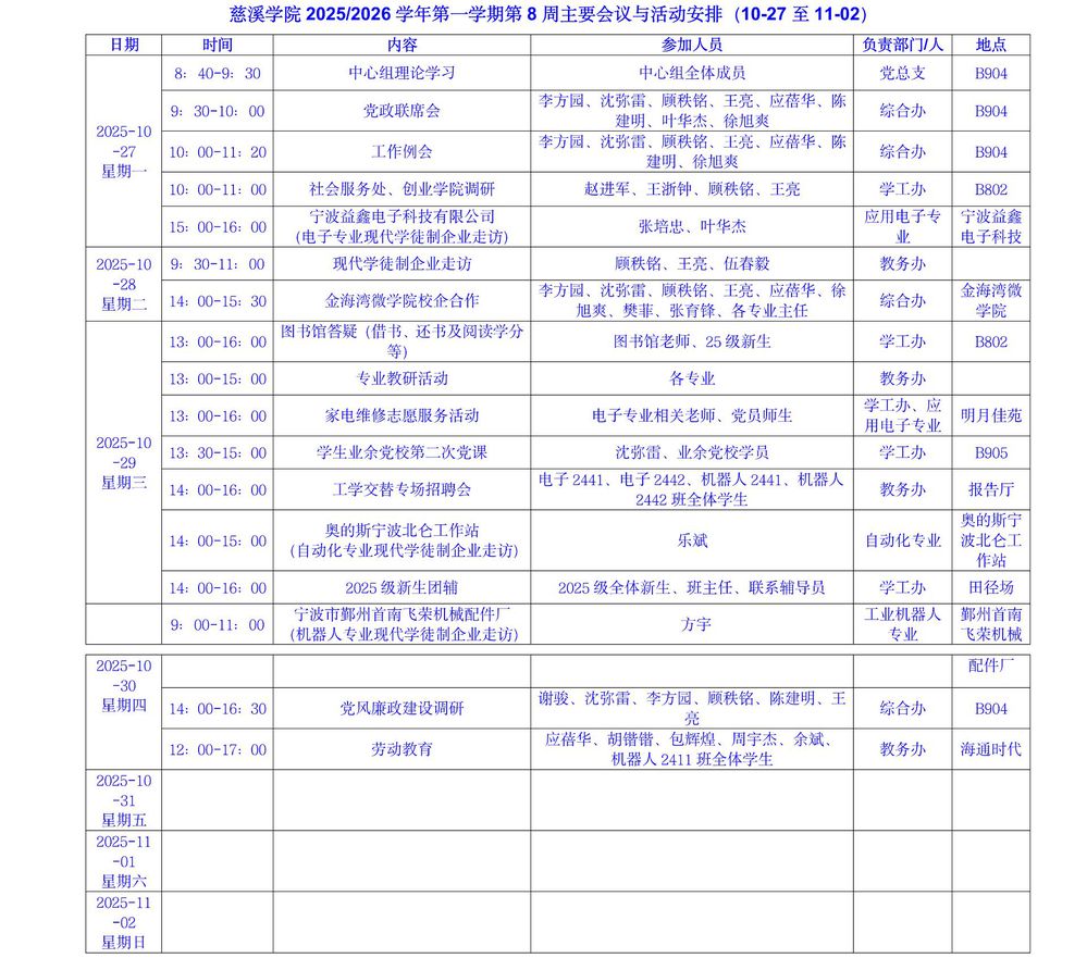慈溪学院2025/2026学年第一学期第8周主要会议与活动安排(10.27-11.02)