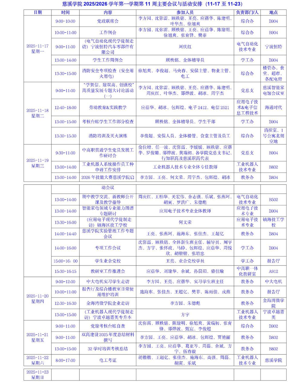 慈溪学院20252026学年第一学期第11周主要会议与活动安排(11.17-11.23)