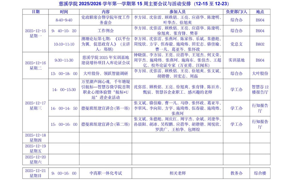 慈溪学院2025-2026学年第一学期第15周主要会议与活动安排(12.15-12.21)
