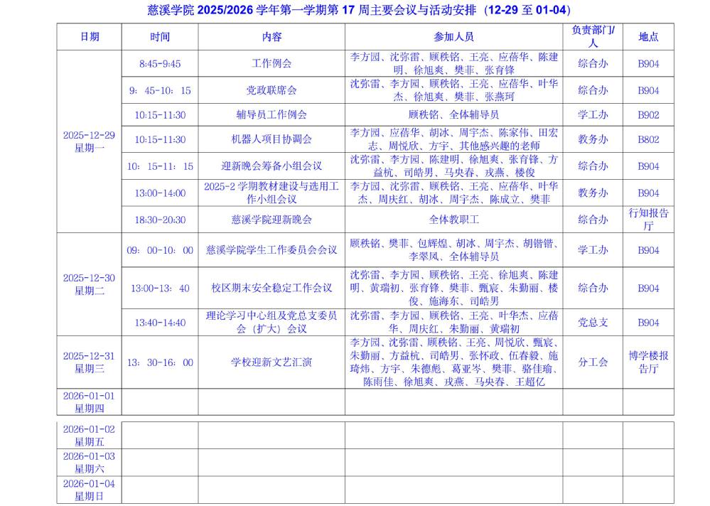 慈溪学院2025-2026学年第一学期第17周主要会议与活动安排(12.29-1.4)
