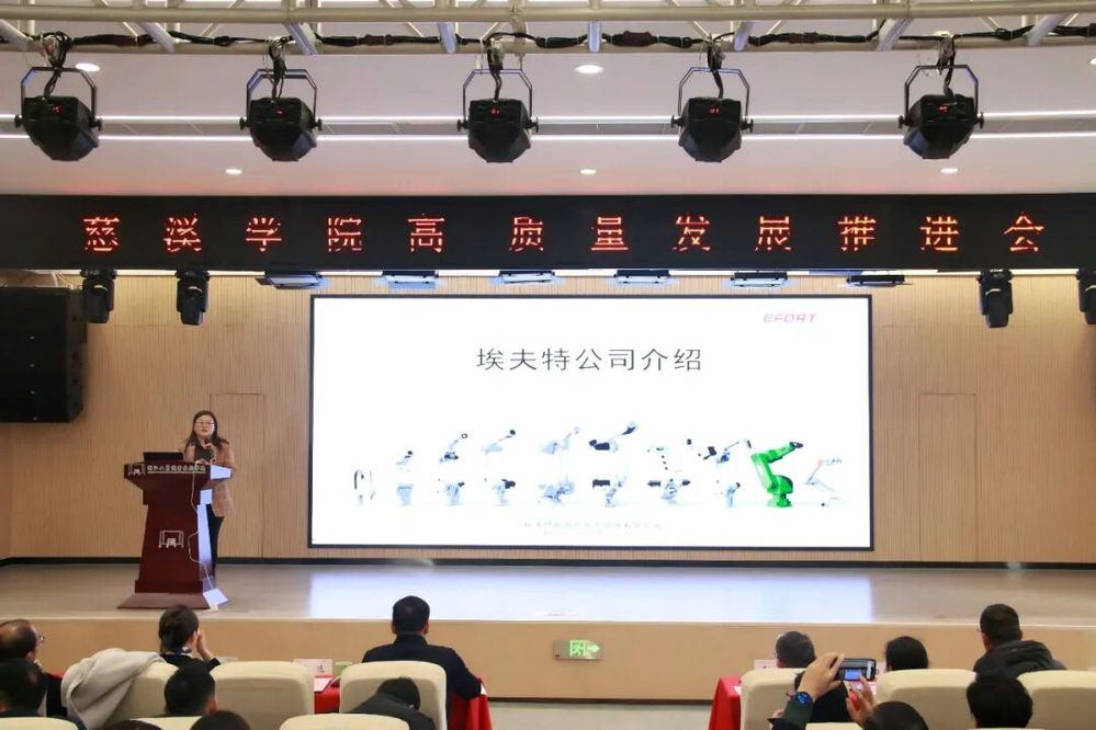 埃夫特作为国家机器人产业链链主企业、首批国家级专精特新“小巨人”,其教育总监、华东大区总经理陈适以“国产机器人发展路程”为主题分享,展现了国产机器人在智能制造领域的技术突破与应用前景,并结合与慈溪企业的合作实践,高度肯定了学院人才培养与本地产业需求的契合度。
