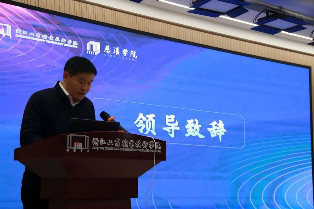 张鹏飞副校长在致辞中强调,慈溪学院作为学校服务县域经济的重要载体,始终坚守“本地招生、本地培养、本地就业”办学特色,深耕县域职业教育,已成为省级县域产业学院示范标杆,也是慈溪产业升级不可或缺的人才基地与技术服务平台。他表示,学校将持续倾斜资源,支持学院与行业龙头企业深化合作,聚焦慈溪智能家电、机器人、智能制造等重点产业需求,优化专业布局、加强技术服务、拓展技能培训,努力破解企业“连续性短期用工”难题,为产业升级提供持续的人才支撑与技术保障,以职业教育的力量助力现代化新慈溪建设。