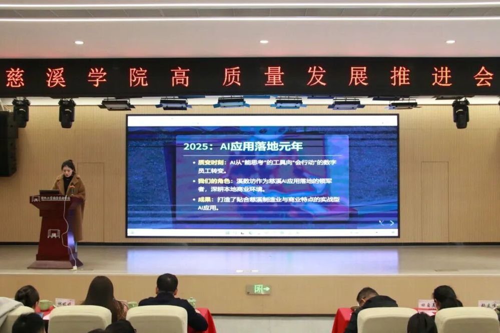 溪数坊负责人方心女士以“AI+制造业的创新与实践”为题作分享,展现了人工智能技术在制造业研发设计、生产制造、营销服务等环节的创新应用,为慈溪传统制造业的数字化转型提供了新思路与可借鉴的实践路径,引发了企业代表的广泛共鸣。