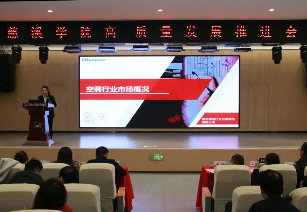 海信日立宁波分公司黄方敏聚焦中国空调行业市场,分享了行业概况与发展趋势。2025年中国中央空调市场规模达1650亿元,多联机组以46.1%的占有率位居首位。她深入剖析了行业痛点与人才需求,指出绿色节能、智慧AI、能源管理已成为行业发展核心方向,无油变频技术、AI能效优化算法等新技术正推动行业转型升级,存量市场更新改造需求潜力巨大,为学院优化人才培养模式、精准对接企业用工提供了重要参考,进一步推动了产教供需的双向对接。