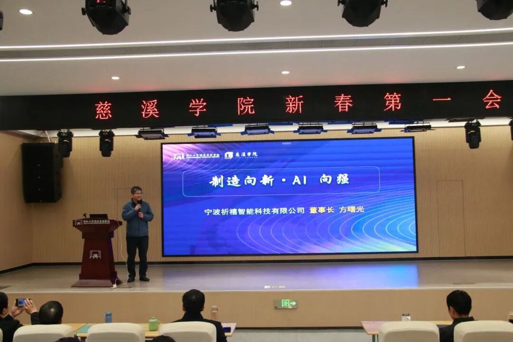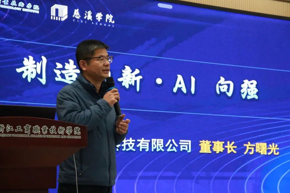 聘任仪式后,方曙光董事长以“制造向新·AI向强”为主题作专题分享。他结合宁波祈禧智能科技有限公司的发展实践,深入解读了智能家电行业的发展趋势、AI技术在制造业中的创新应用,以及企业对高素质技术技能人才的核心需求。方曙光指出,职业教育是产业发展的重要支撑,慈溪学院应立足慈溪制造业重镇的区位优势,深化产教协同育人,培养更多兼具专业技能与创新思维的复合型人才,为智能制造产业发展注入不竭动力。