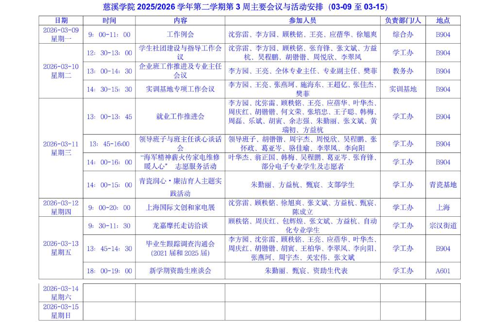 慈溪学院2025/2026学年第二学期第3周主要会议和活动安排(03-09至03-15)