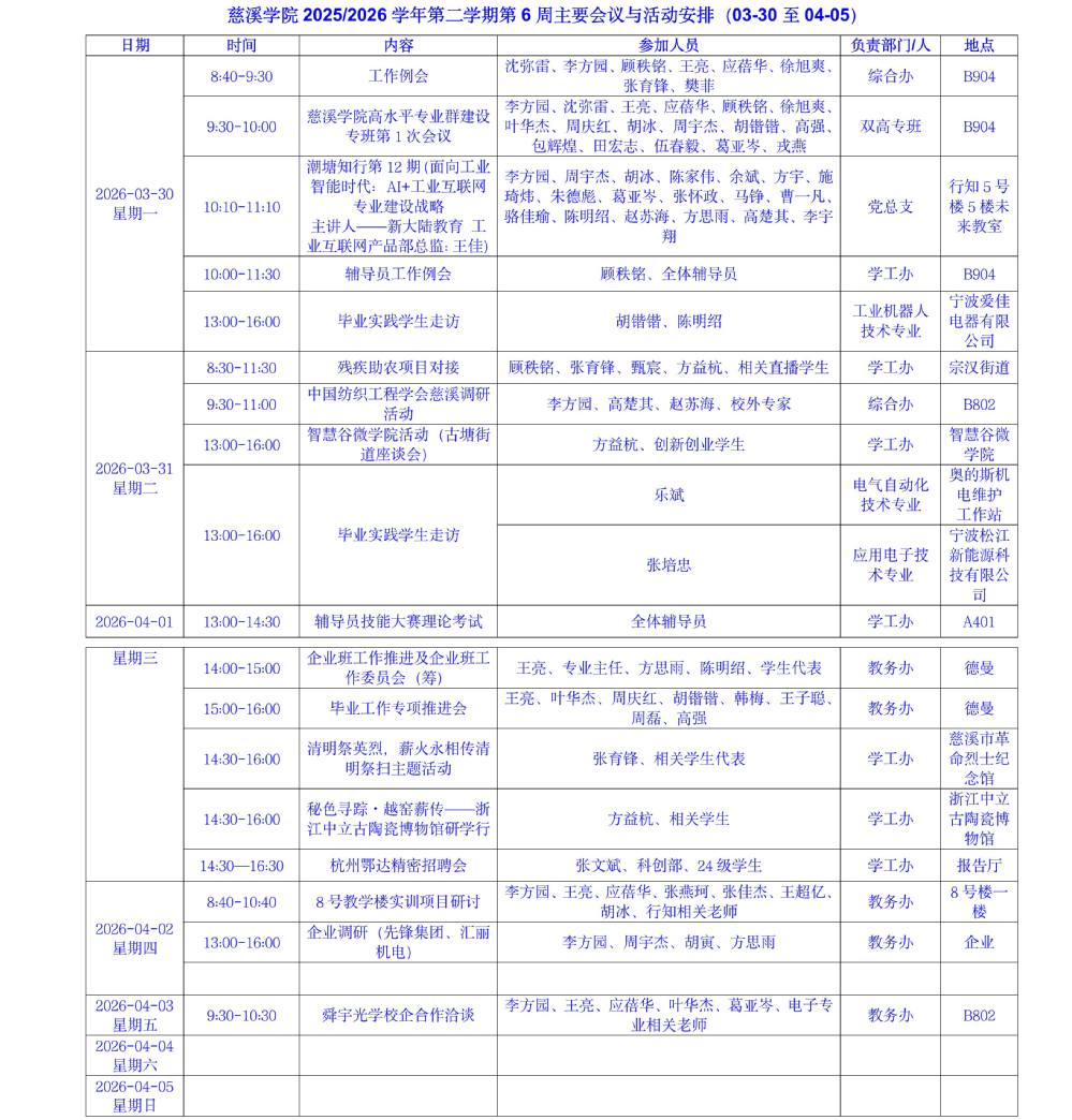 2025/2026学年第二学期第6周主要会议与活动安排(03-30至04-05)