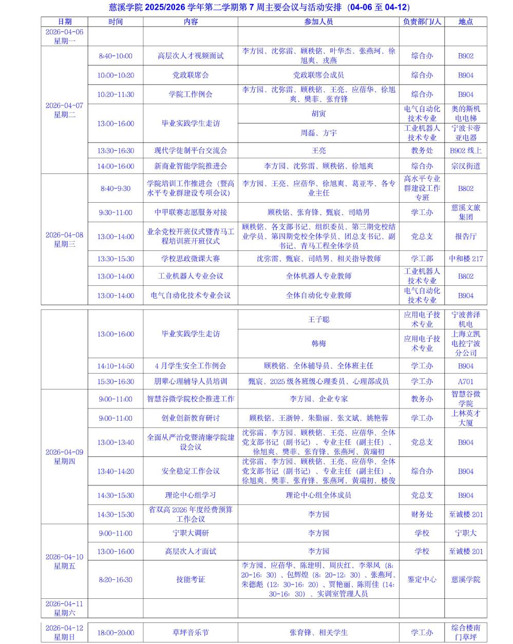 2025/2026学年第二学期第7周主要会议与活动安排(04-06至04-12)