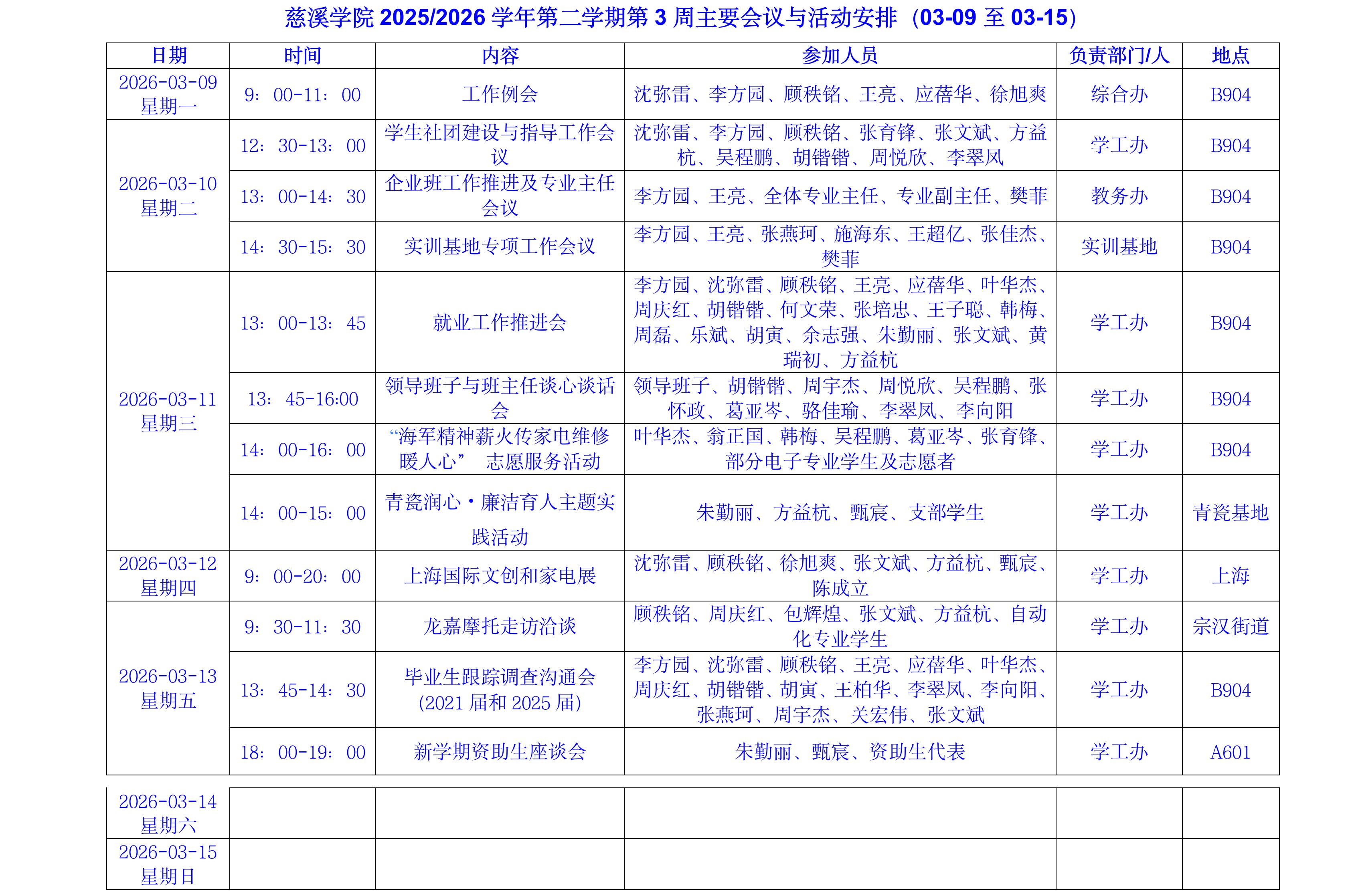 慈溪学院2025/2026学年第二学期第3周主要会议与活动安排(03-09至03-15)