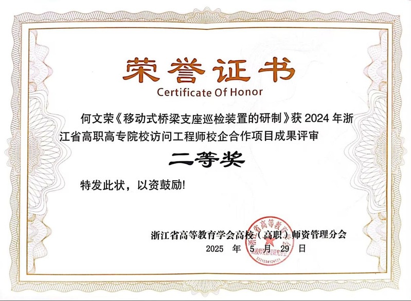 本次成果评审中,全省高职院校从350多项结题项目中,共推荐96个优秀访问工程师校企合作项目参与交流评审。经首轮网上评审,20个优秀项目脱颖而出,成功入围现场交流汇报与答辩环节。其中,何文荣老师主持的“移动式桥梁支座巡检装置的研制”项目,是与访工企业宁波阿贝尼红外技术有限公司开展的校企合作项目。该项目设计了一种基于轨道的自动巡检装置,可对高架桥梁支座进行快速、高效、安全的远程巡检,大幅提升巡检效率,节省巡检成本并降低工作风险,得到了用户高度认可。何老师还将项目成果充分运用到教学实践与学生培养中,把企业实际案例融入课堂教学与课程建设,丰富专业课程教学资源,提升教学质量。同时,以项目为依托指导学生参与专业竞赛,帮助学生掌握前沿技术和实践技能,培养解决实际工程问题的能力。