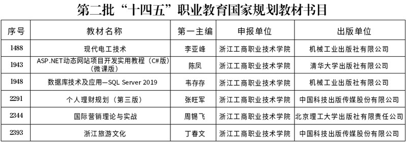 近日,教育部公布第二批“十四五”职业教育国家规划教材遴选结果,我校教师作为第一主编的6种教材成功入选,入选数量位列全省第5名、全国第54名,是我校在教材申报竞争性评审中取得历史最好成绩。截至目前,我校累计已有19种教材入选“十四五”职业教育国家规划教材,这是对我校课程改革成果与教材建设水平的认可,彰显了我校在职业教育教材建设领域的积淀与成效。