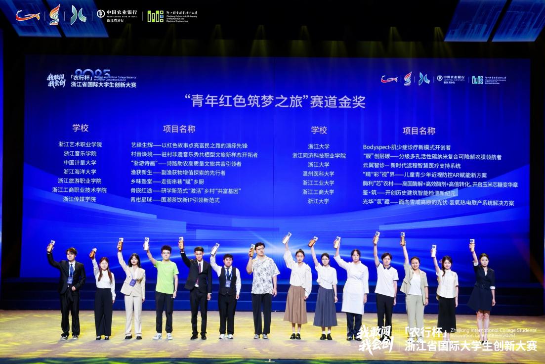 2025年7月13日,“农行杯”浙江省国际大学生创新大赛(2025)决赛圆满落幕。浙江工商职业技术学院宁海学院工业设计专业师生团队凭借项目《骨嵌红途——研学新范式“激活”乡村“共富基因”》斩获“青年红色筑梦之旅”赛道金奖,实现了我校工业设计专业在该项赛事的历史性突破!