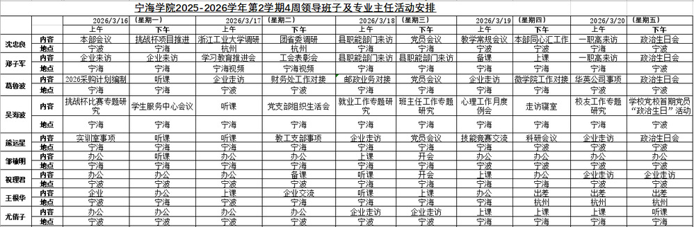 宁海学院2025-2026学年第二学期4周领导班子及专业主任活动安排