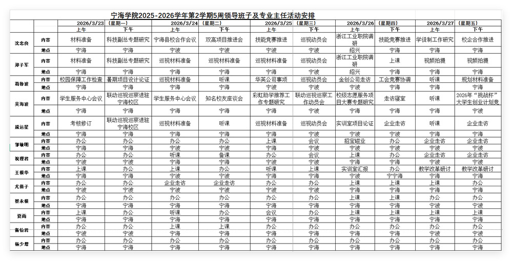 宁海学院2025-2026学年第2学期5周领导班子及专业主任活动安排