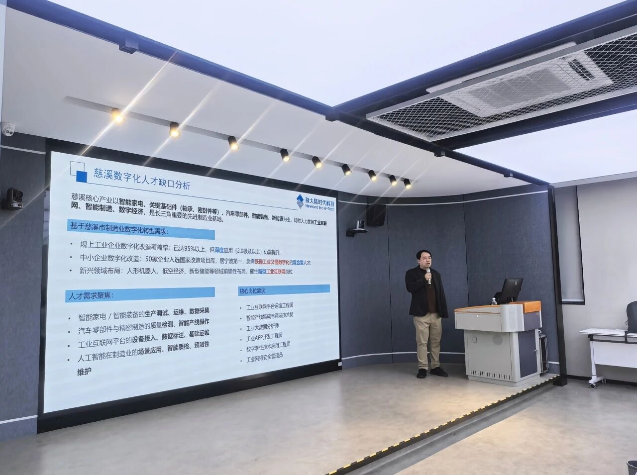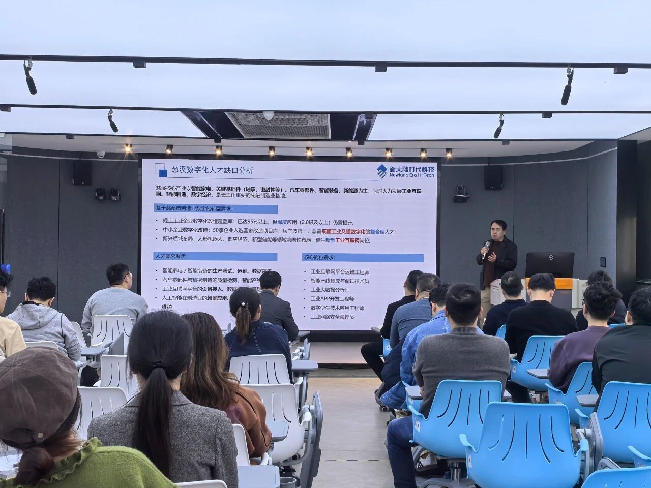 为深入对接慈溪市工业产业数字化转型需求,推动专业建设与产业发展同频共振,2026年3月30日,浙江工商职业技术学院慈溪学院“潮塘知行”第十二期专题讲座在5号楼5楼未来教室顺利举行。本次活动以“面向工业智能时代:AI+工业互联网专业建设战略”为主题,特邀新大陆教育工业互联网产品部总监王佳担任主讲嘉宾。慈溪学院全体新教师、部分专业主任,以及宁波行知中等职业学校双优专业的青年教师共同参会,围绕产业人才需求、专业建设路径展开深度研讨。
